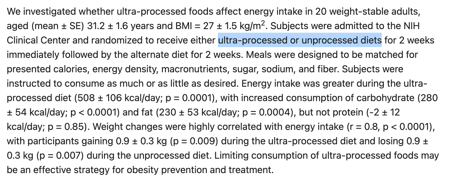 These results are interesting — they tell us a lot about the effects of food processing, but nothing about the difference between processing and ultra-processing. (Which - allegedly — makes all the difference).